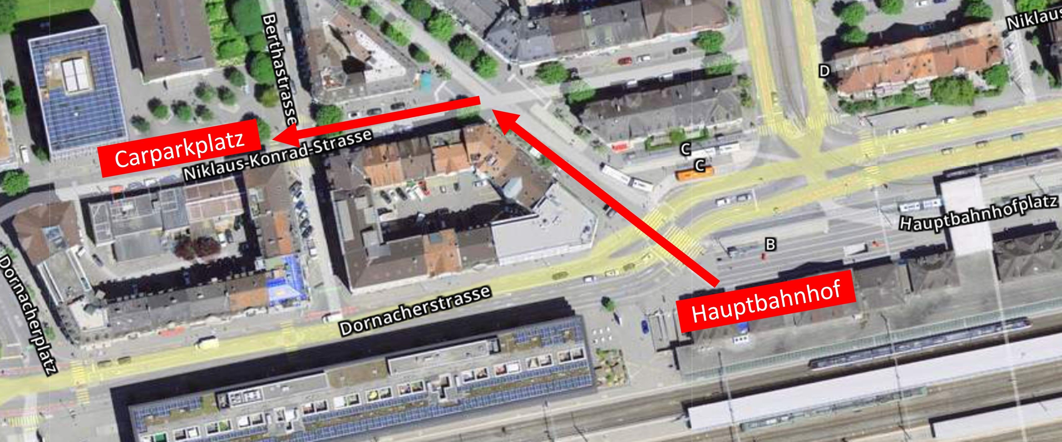 Ab 17:00 – 18:30 Uhr Shuttle ab Carparkplatz am Amthausplatz (Nähe Baloise Bank) mit Zwischenhalt beim Carparkplatz an der Niklaus-Konrad-Strasse (Nähe Solothurn Hauptbahnhof) rund 10 Minuten später. Der Shuttle fährt ca. im 30-Minuten-Takt.